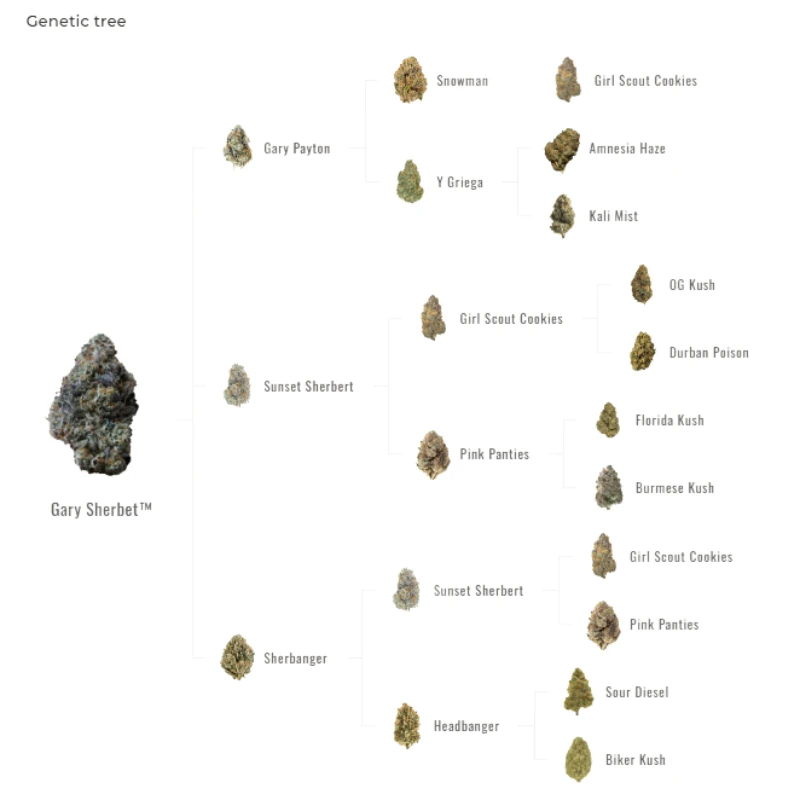 Gary Sherbet se basa en un único concepto: la superposición de genéticas derivadas de Sherbet en varios niveles. La base es Gary Payton (Cookies Seed Bank) cruzada con Sunset Sherbet. Esta base se desarrolló posteriormente introduciendo Sherbanger (Sunset Sherbet × Headbanger) de Boston Roots Seed Co.